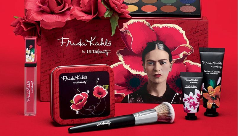 Творчеството на Фрида Кало остава вдъхновение за много съвременни художници и модни дизайнери. Ярки флорални мотиви се появяват този път върху козметичните опаковки - пурпурни кутии и козметични чанти на марката Ulta Beauty са украсени с разцъфващи божури, ванилия и орхидеи. Колекцията включва девет различни продукта за безупречен грим - палитра от сенки, течно червило, комплект четки, основа за грим, диадема от рози и други – всичко това в най-добрите традиции на Фрида. Освен това, портретите на художничката украсяват козметични чанти и калъфи, върху флакончетата и капачките на козметичните продукти греят нейни репродукции, а характерните червени рози стават декорация за коса.