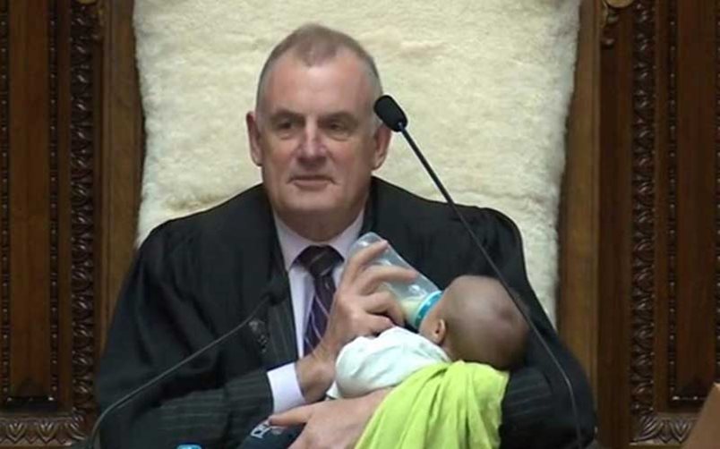 Председателят на парламента на Нова Зеландия Тревър Малард преди няколко дни имаше специален гост - по време на заседание той държеше на ръце едномесечно бебе, което нахрани и което развличаше, докато траеха дебатите в парламентарната зала.