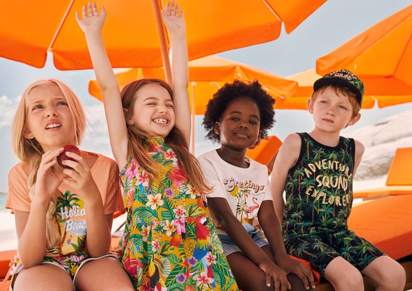 Облеклата са изработени от тъкана вискоза и памук от Better Cotton Initiative - организация, подкрепяща устойчивия добив на памук. Колекцията оживява в лятна цветова палитра от яркозелено, тюркоаз и топли слънчеви нюанси на коралово и жълто за момичетата, черно и бяло за момчетата, и металически отблясъци за финал.