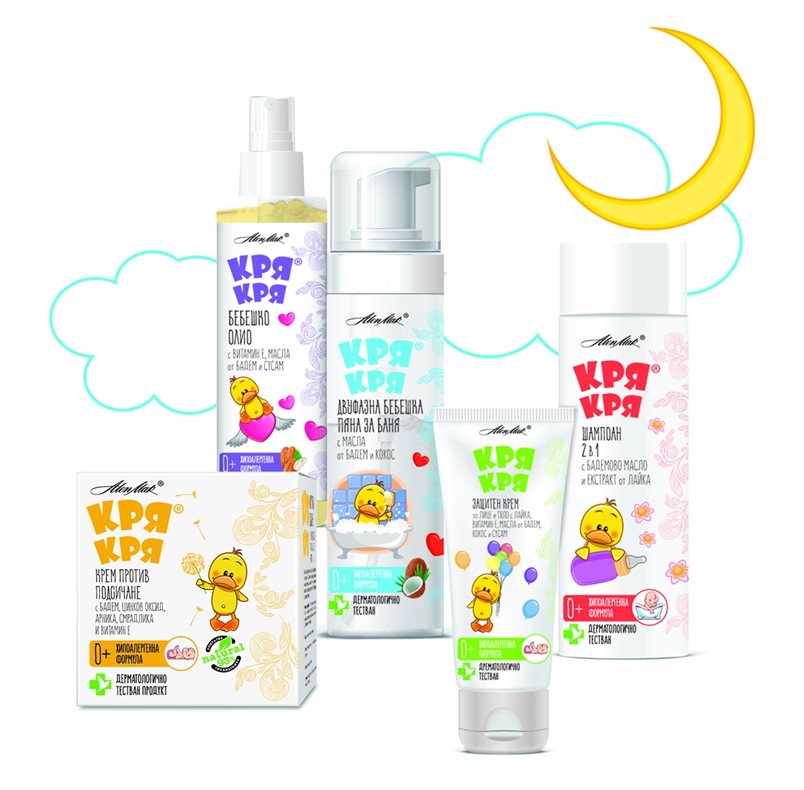 Познатото на всички малко жълто патенце вече ще радва и най-малките! Дерматологично тестваните продукти от серията Кря Кря са специално разработени за деликатните нужди на чувствителната бебешка кожа. Те са с лабораторно доказани тестове за хипоалергенност.
