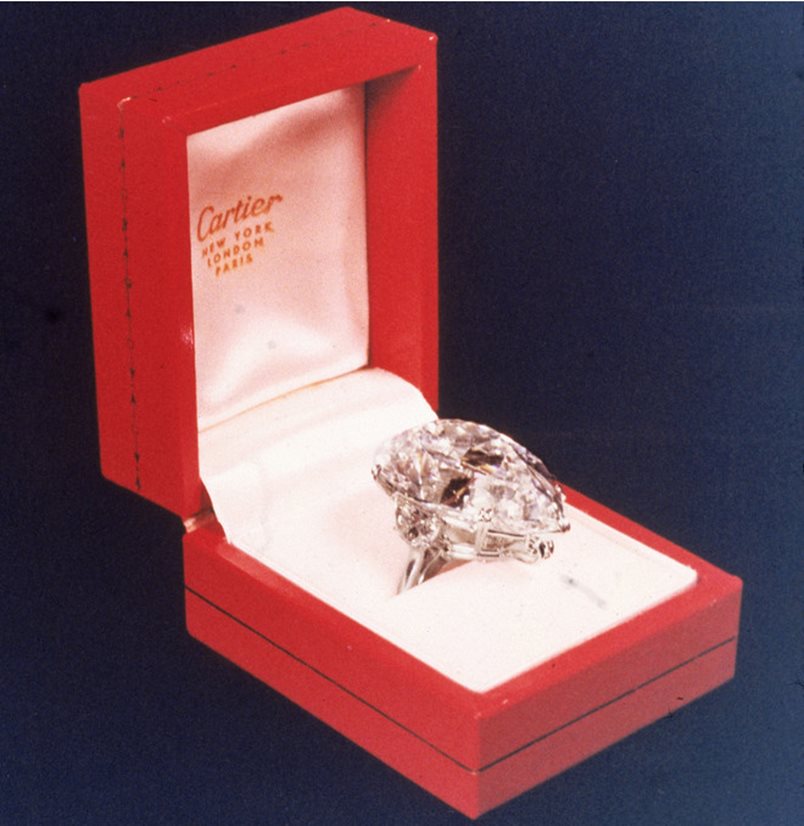 Историята му започва през 1966 г., когато в една от мините в Южна Африка е намерен диамант с тегло 240,8 карата. Скоро след това камъкът е придобит от „краля на диамантите" Хари Уинстън, който му придава крушовидна форма и намалява теглото му до 69 карата, а след него го придобива Хариет Аненберг Еймс. Няколко години по-късно тя решава да го пусне на търг, тъй като не може да ходи с него из Ню Йорк и прекарва всичките си дни в хранилището - единственото място, където може да му се любува. На търга го купува френската модна къща Cartier, а още на следващия ден камъкът е откупен от Ричард Бъртън за 1,1 милиона долара.