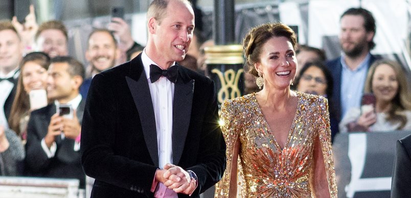 За бляскавия повод херцогинята на Кеймбридж облече златна рокля Jenny Packham с пайети, паднали рамене и палерина, съчетана с естествена коса, изключително семпъл грим и висящи обици. Като истински Бонд, Уилям се появи на червения килим с класически смокинг.