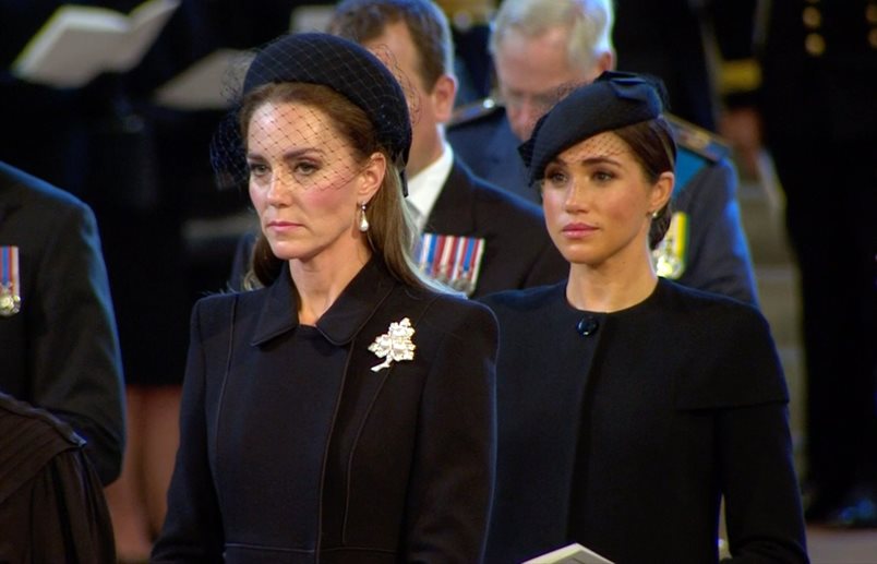 Всяка от жените деликатно отдаде почит към Кралицата чрез своите тоалети. Меган носеше чифт обеци с диаманти и перли, подарени й от покойния монарх, докато Кейт носеше брошка с диаманти и перли във формата на три листа, която някога е принадлежала на кралица Елизабет.