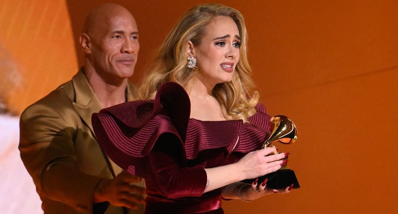 "Това е едно от най-странните неща, които разбрах тази вечер", обяви водещият Тревър Ноа на престижната музикална церемония. "Човекът, когото Адел винаги е искала да срещне, но така и не е успявала е Дуейн Джонсън. Разбрах, че и той е твой голям фен."