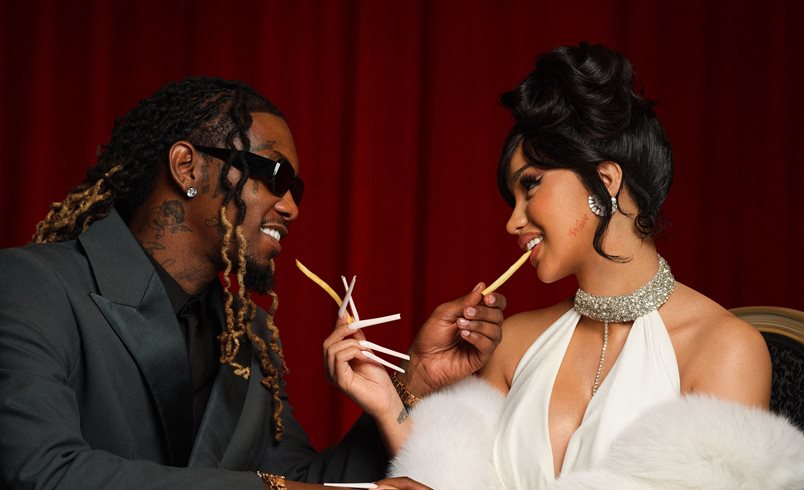 На тях двамата с Offset се наслаждават на романтична вечеря в McDonald's - облечени като за гала вечеря, държащи чаши за шампанско, но пълни с газирана напитка.