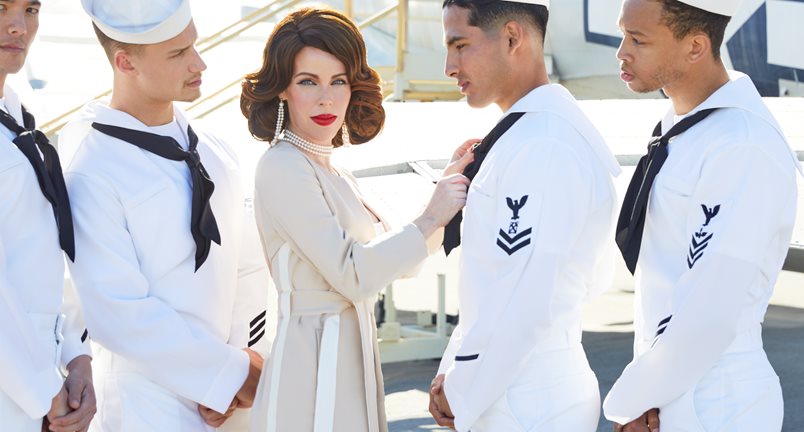 Рокля Nookie, обувки Bella Belle, палто Akira, бижута Club L London, куфар и морски униформи White Cross Collections