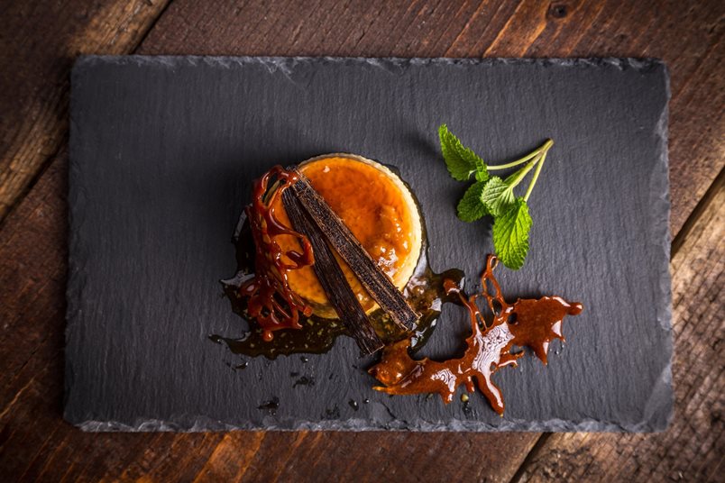 2. През това време разбийте яйцата със захарта и ванилията, след което добавете и прясното мляко и отново разбъркайте за карамелената смес.