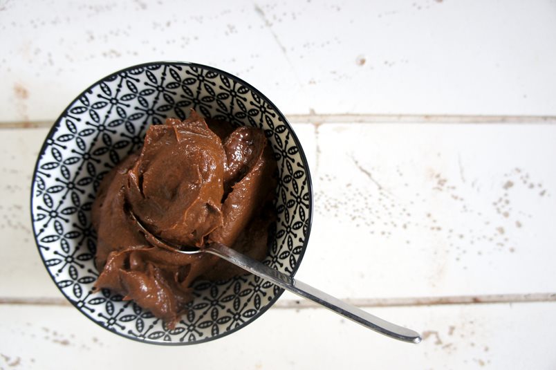 Вземете авокадо като основна съставка - ако все още не сте наясно, това е цяло съкровище с полезни полиненаситени мазнини, които намаляват възпалителните процеси в тялото, подобряват подхранването на тъканите и имат положителен ефект върху състоянието на косата и кожата. Добавете какао на прах към месото на два броя авокадо - важно е в сместа да няма захар. Пасирайте сместа в блендер. За да я направите по-течна, можете да добавите кокосово или бадемово мляко. И ако все пак не е достатъчно сладка, добавете малко от сиропите, които се използват като заместители на захарта – сироп от фурми, стевия или земна ябълка.