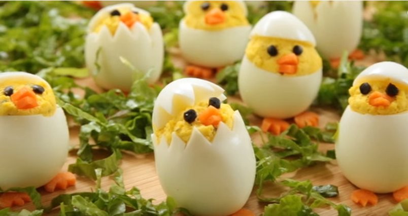 Яйцата се разрязват, както е показано във видеото, жълтъците се изваждат в купа, намачкват се с вилица, прибавят се останалите съставки и всичко се обърква добре. След това белтъците се напълват с тази смес с помощта на шприц или пликче за фризер, на което сме изрязали края, като се оформя връх, така че да се образува глава на пиленце. Отгоре се поставят по-малките парчета белтъци, като шапчици, а очите и нослетата на пиленцата се правят от маслини и морков.