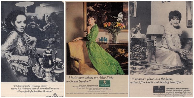 Така прави и марката AFTER EIGHT®, започвайки да промотира уникалния си продукт със серия реклами през 60-те. Те включвали популярни жени за времето си, тогавашните инфлуенсърки, ако можем да ги наречем така с намигане. За да подчертаят усещането за премиум качество и луксозно изживяване, AFTER EIGHT® създават реклами, които показват висшето общество в любимите им занимания - карайки Ferrari, разхождайки се из големите си дворове, вечеряйки в приятна атмосфера, разбира се винаги в компанията на най-специалните шоколадови бонбони.