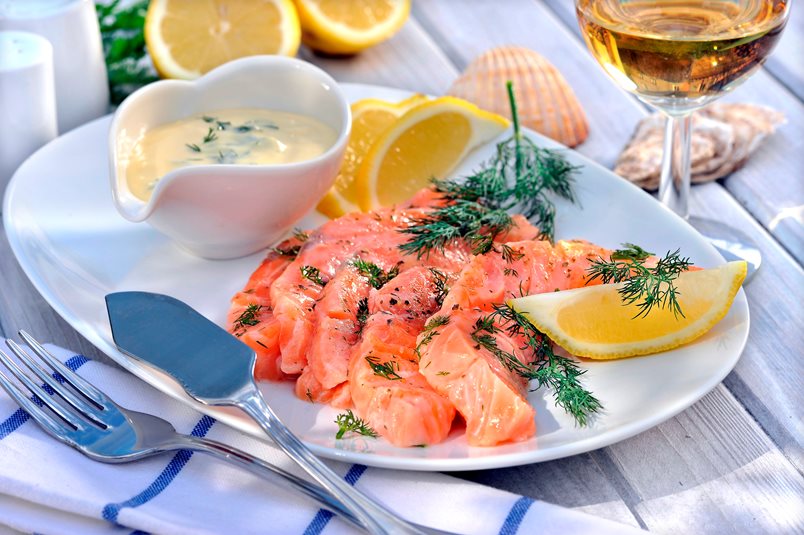 НЕОБХОДИМИ ПРОДУКТИ: 1 кг. филе от сьомга / 50 г. морска сол / прясна мащерка / 1 с.л. ситно нарязан копър / 100 гр. масло / сокът на 1 пресен лимон / 4 с. л. зехтин / 100 мл. джин