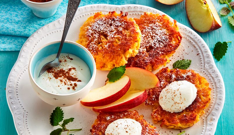 • 3 ч.ч. настъргани ябълки • 1 ч.ч. натрошени ядки • 2 с.л. кленов сироп и плодове (по желание)