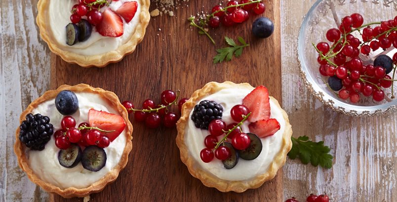 • 1 ч.ч. брашно • 2 с.л. пудра захар • 100 г масло • 1 жълтък • 1 1/2 с.л. вода • 250 г маскарпоне • 2 с.л. кафява захар • 1/2 ч.л. ванилия • пресни плодове по избор