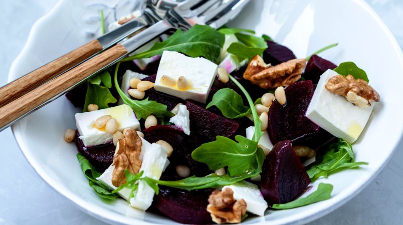 3. Поставете руколата в купа, залейте с винегрета, а след прибавете цвеклото, сиренето и ядките. Съставките би следвало да осигурят салата за двама души.