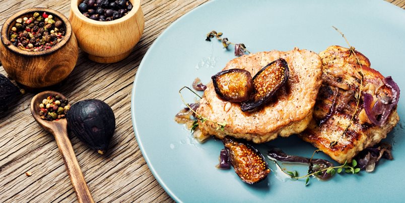 телешко или свинско месо / 4-5 смокини / сол / черен пипер / чесън / лимонов сок / мащерка, босилек и риган / зехтин