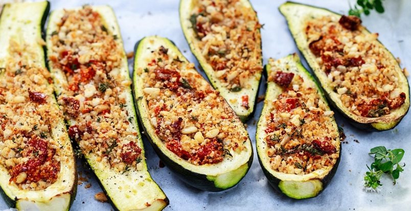 4. Напълнете тиквичките със сместа. Поставете ги тава и изпечете в предварително загрята на 180 градуса фурна за 7-8 минути.