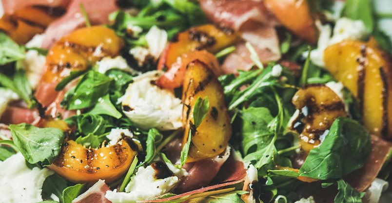 Сладостта на прасковите контрастира перфектно със солеността на прошутото и синьото сирене, а чашата вино в непосредствена близост до чинията е просто задължителна.