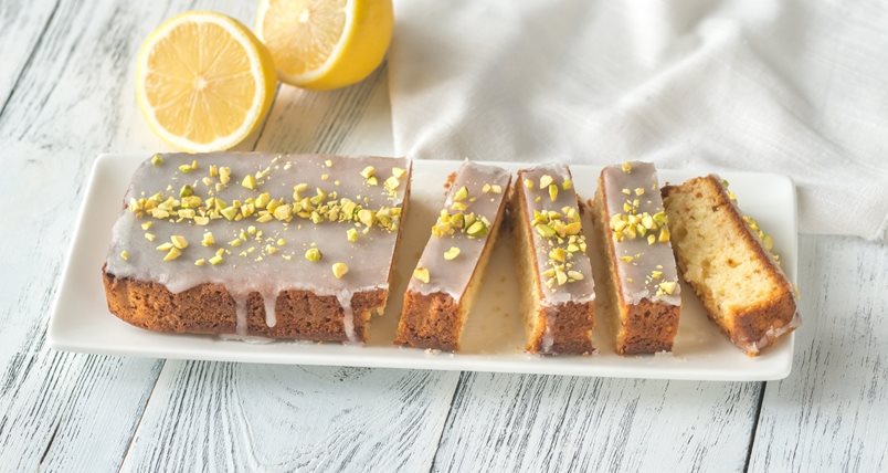 • 50 г брашно • 3/4 ч.л. бакпулвер • 80 г ситно смлян шамфъстък • кора от 2 лимона • 100 г бадемово брашно • 150 г масло • 150 г пудра захар • 3 яйца • гръцки йогурт