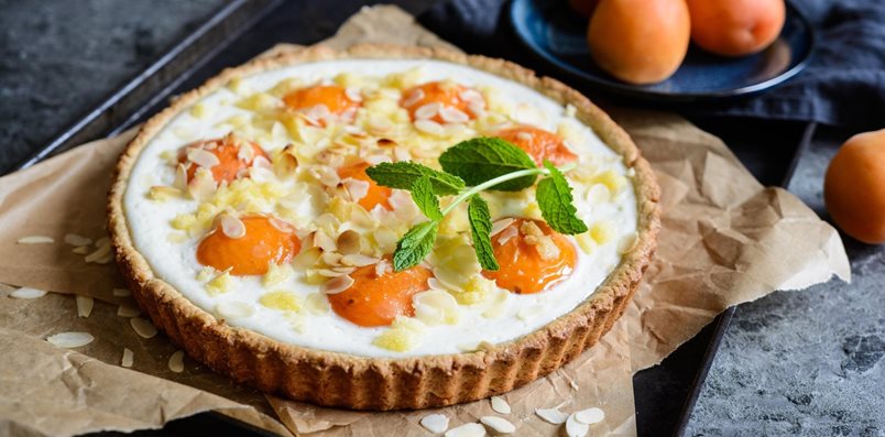 3. Върху цялата повърхност на вече изстиналия блат поставете нарязани парчета кайсии, след това изсипете сместа със сирената и печете за още 50 минути.