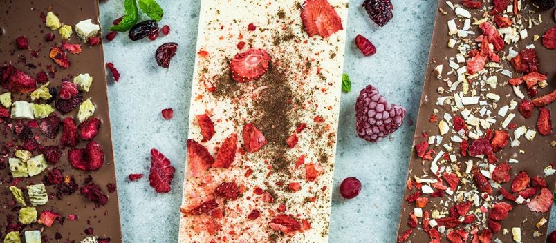 3. Изсипете разтопения шоколад върху хартия за печене. Добавете сместа с плодовете отгоре.