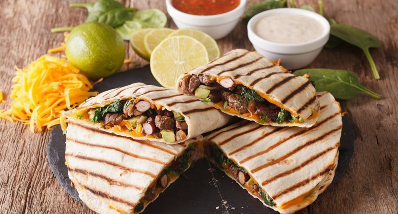 • 2 с.л. доматено пюре • 300 г чедър • 1 лайм • 200 г боб • зеленчуци по желание • питки за тортила • заквасена сметана с малко майонеза, горчица и чесън