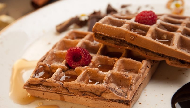 6. Заливате готовите гофрети със соса и течен шоколад. Ако търсите абсолютен guilty pleasure, добавете пресни плодове и ванилов сладолед.