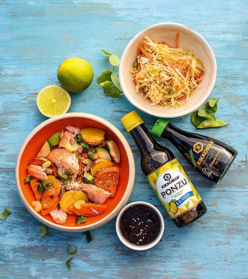 4. Поръсете със соса и за финал не забравяйте да добавите ПОНЗУ цитрус соев сос KIKKOMAN. ПОНЗУ ще обобщи вкусовете и ще добави още свежест и умами в чинията ви.