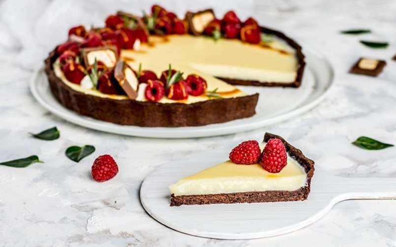 Оставете готовия блат да изстине напълно и през това време сварете пудинга според указанието на опаковката. Изсипете готовия крем, докато е още топъл, върху шоколадовия блат и приберете тарта в хладилника за няколко часа. Украсете с малини, бисквитки и карамел.