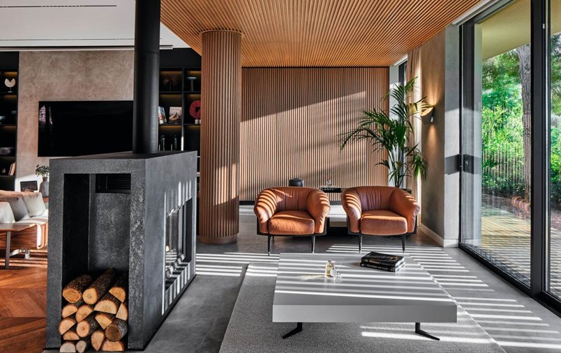Входът е приветлив и насочва посетителите от екстериора към жилищните помещения, а топлото взаимодействие на дърво и мрамор задава тона за плавен преход към съседните пространства, включително кухнята и другите жилищни зони, достъпни през отворени коридори. В сърцето на къщата е всекидневната, която включва трапезария и отделен салон за релакс. Полупрозрачните плъзгащи се врати отварят пространството, създавайки естествена връзка между интериора и екстериора. Усещането за диалог се засилва с артистичното използване на коридорите за свързване на спалните и другите стаи, подсилено от специална селекция произведения на изкуството. Основната спалня, две стаи за гости и стая за хоби са придружени от отделни обслужващи зони, гарантиращи, че функционалното разнообразие на къщата е съчетано с безпроблемна организация, гордеят се с проекта си архитектите от Ofisvesaire.