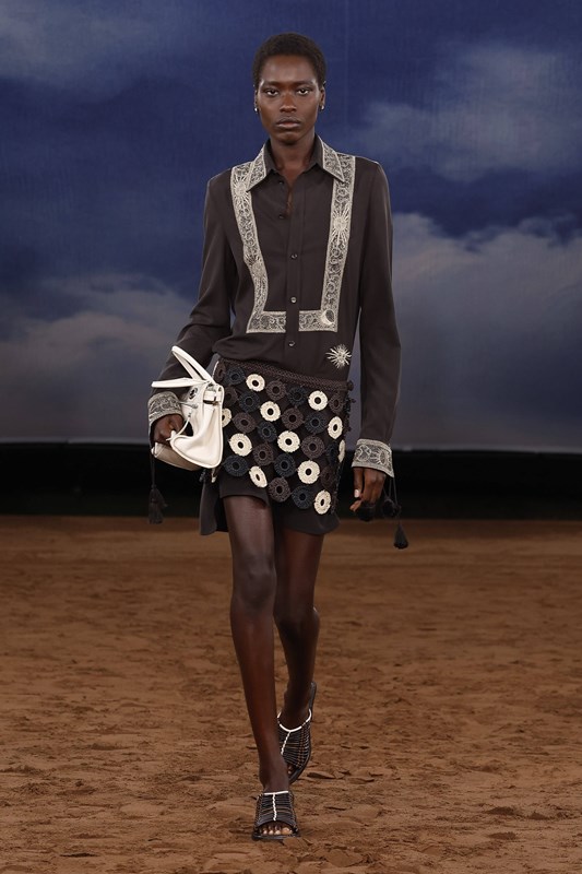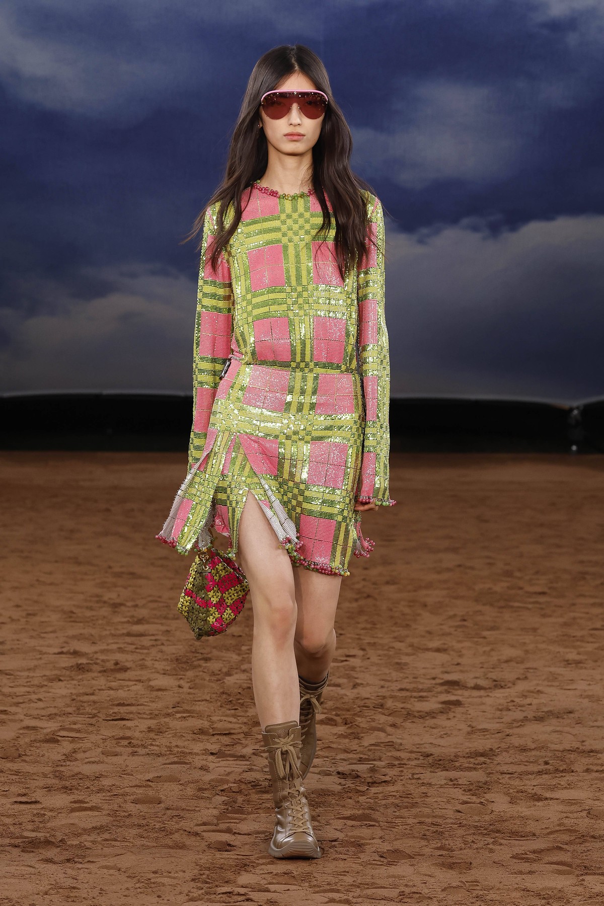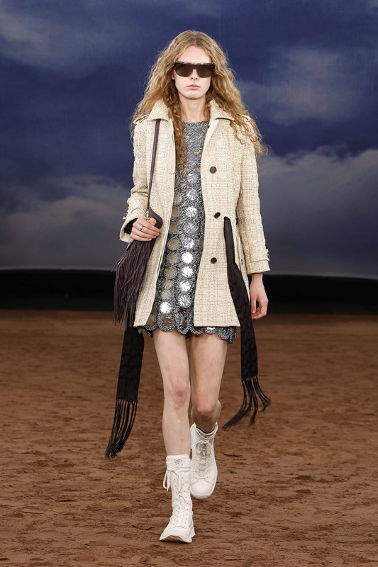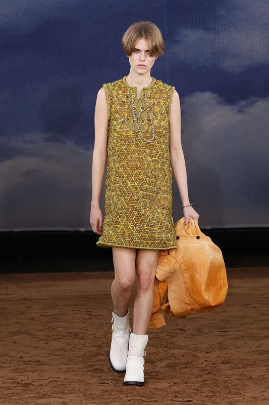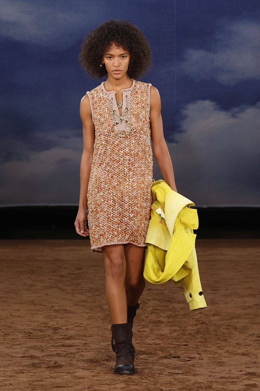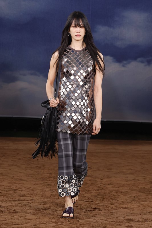 Минидължините се завръщат със замах – в ефирни рокли, миникилтове с пайети и А-силуети. Класическото Burberry каре получава Pop Art интерпретация в нюанси като лавандула, лайм и аква. Плетки, ресни и текстура доминират в дневните визии, докато вечерната част залага на гланцови материи и сатенени костюми с блясък.
