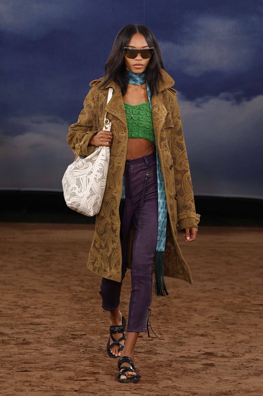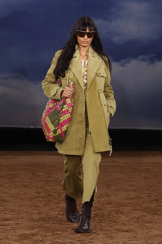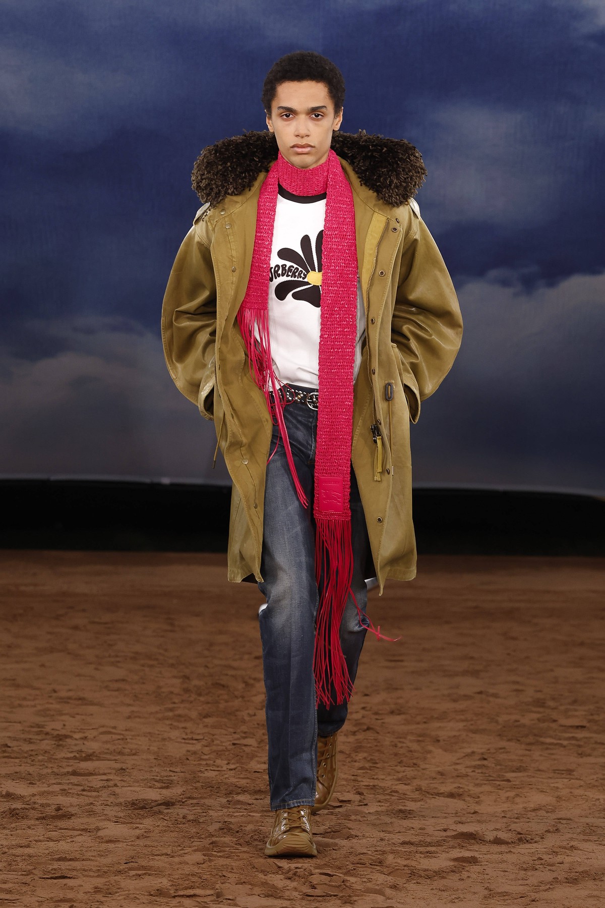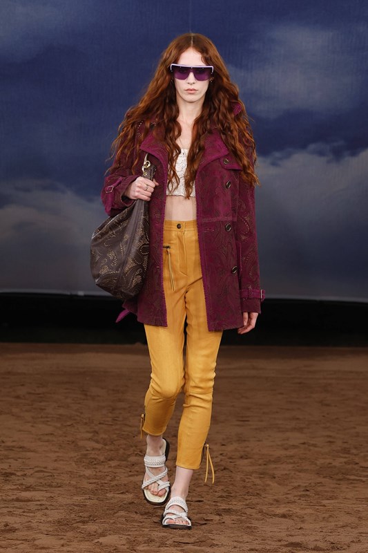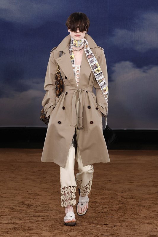 Lee преосмисля и функционалността – водоустойчивите покрития се прилагат не само върху тренча, а върху деним, рафия и памук. Това е Burberry, но със свободата на сцена на открито – готово да се движи, да звучи и да се забелязва.