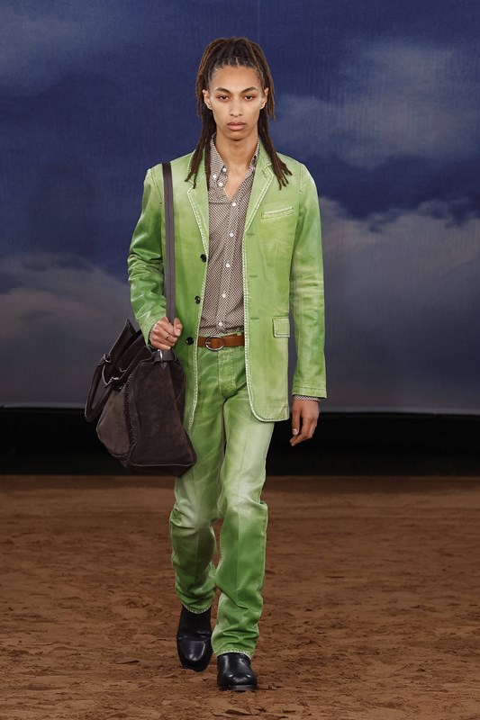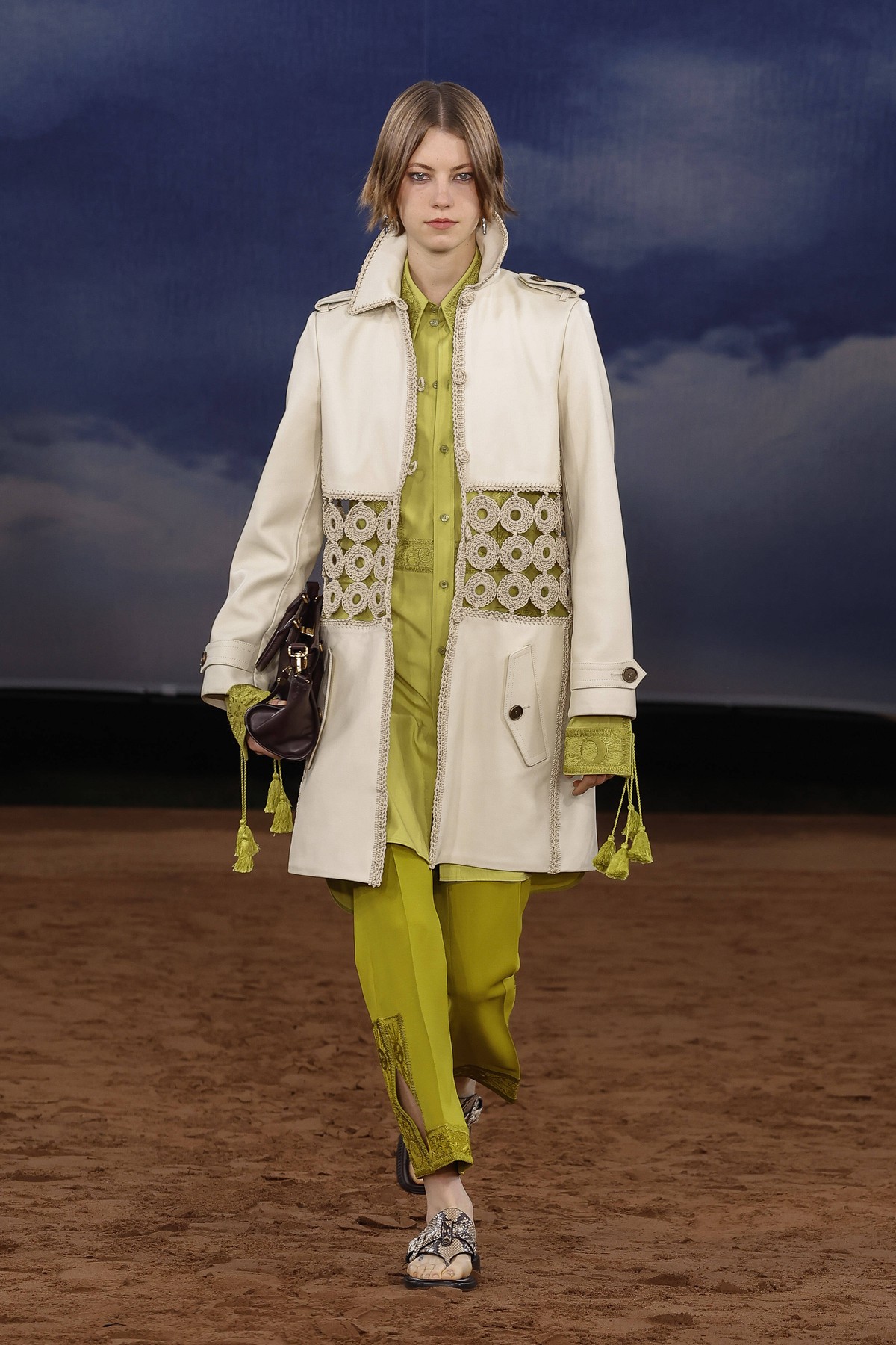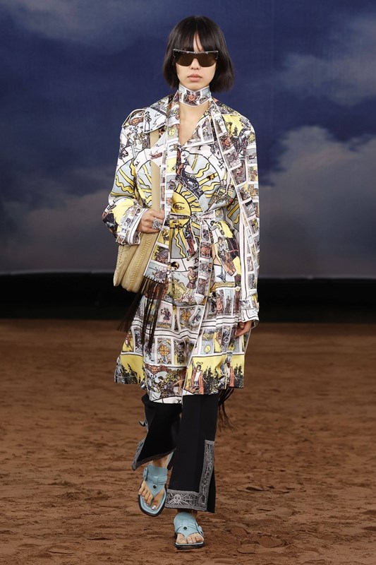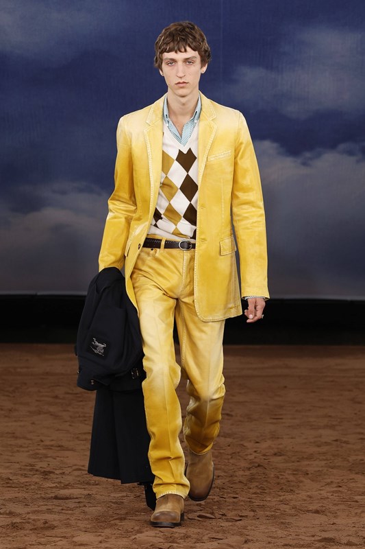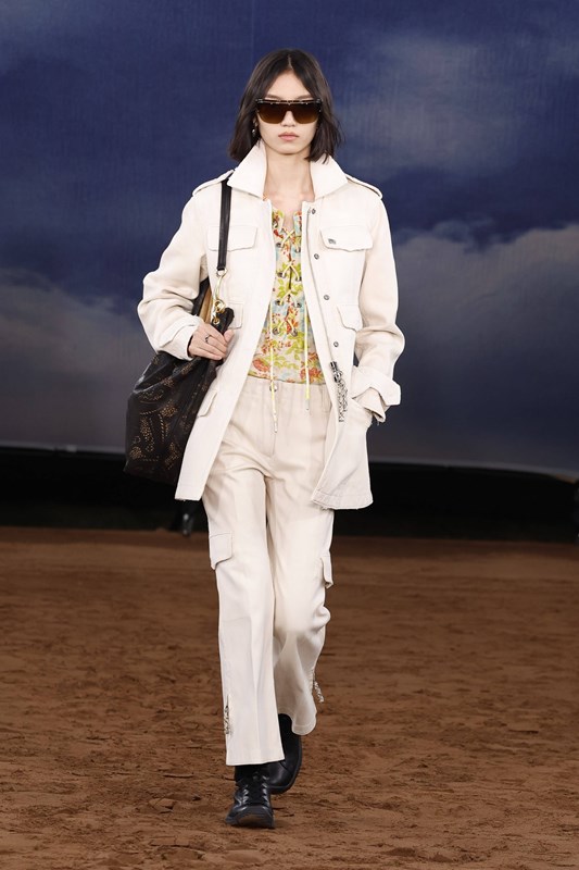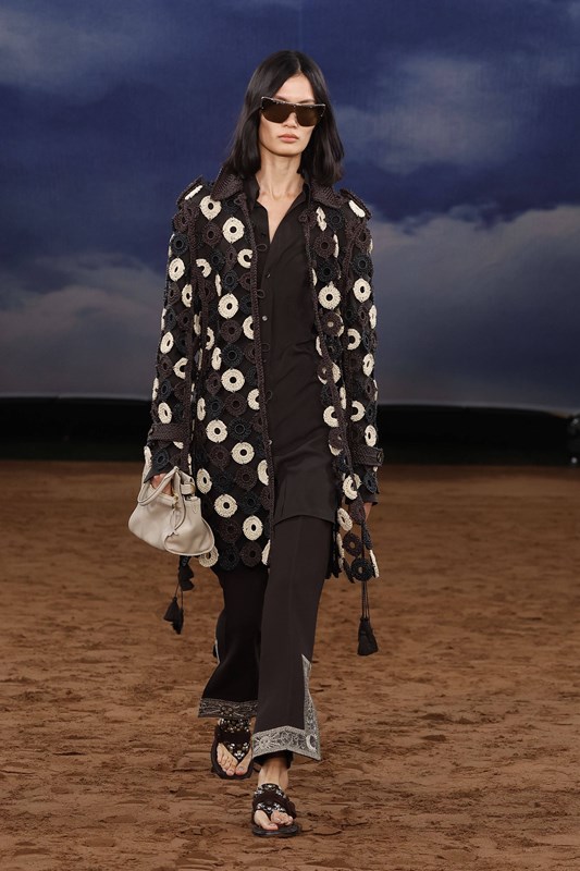Lee преосмисля и функционалността – водоустойчивите покрития се прилагат не само върху тренча, а върху деним, рафия и памук. Това е Burberry, но със свободата на сцена на открито – готово да се движи, да звучи и да се забелязва.
