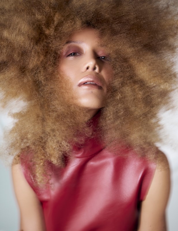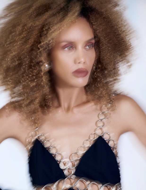 At the center of this storm stands muse Alexa Garcia, who commands the frame with a gaze that pierces through the distortion. She is an anchor in the wash of white and blue, her presence amplified by the work of beauty artist Angie Almah. Almah constructs a look that celebrates raw, natural power. Garcia’s hair is sculpted into a magnificent, gravity-defying halo that catches the light with every turn, while her skin is left luminous and fresh, allowing the clothes and the attitude to speak without competition.
