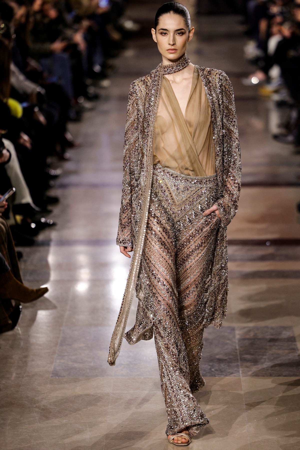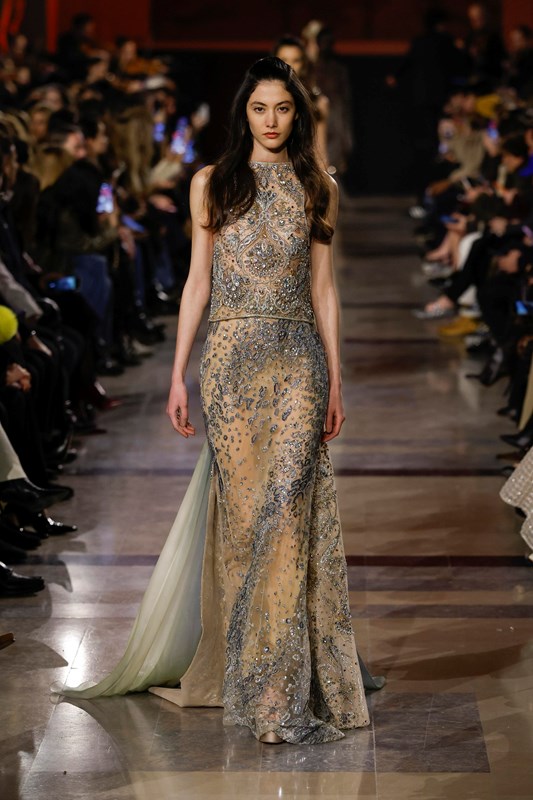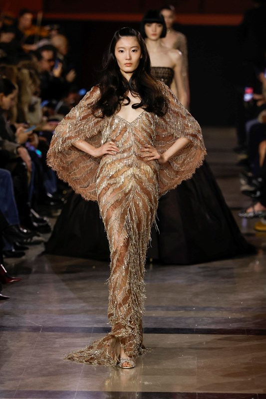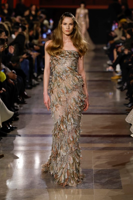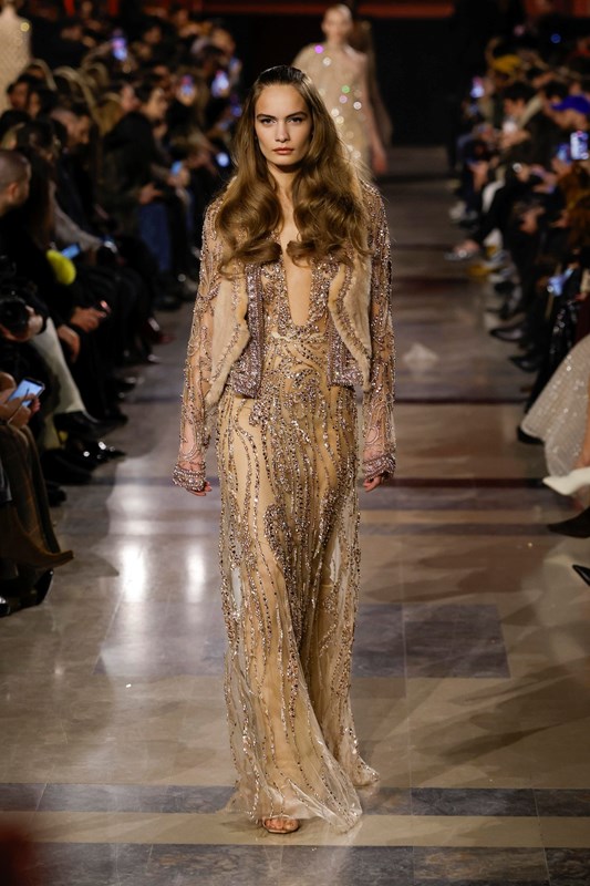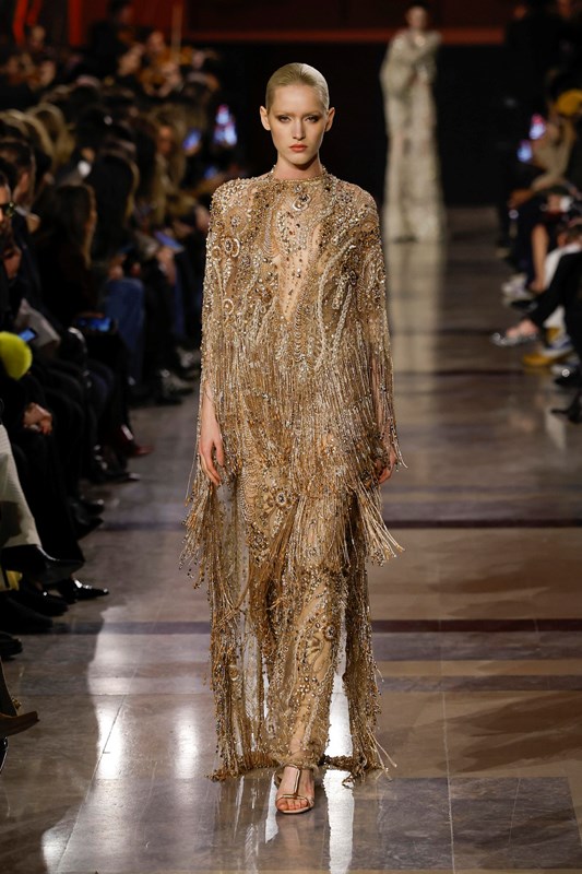 Elie Saab интерпретира носталгията по 70-те години, като поставя акцент върху няколко ключови нови тенденции. Колекцията залага на металически монохроми и се забелязва доминацията на злато, бронз и шоколадови нюанси. Тази бляскава естетика подсказва завръщане към максимализма, но в по-изчистена форма.