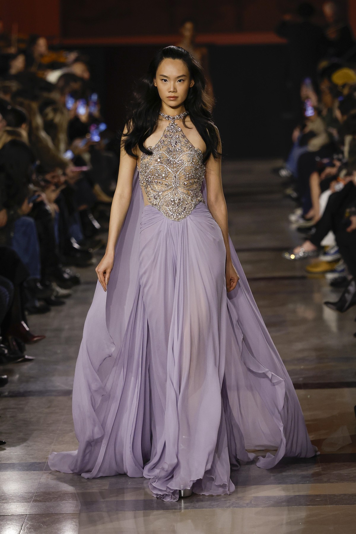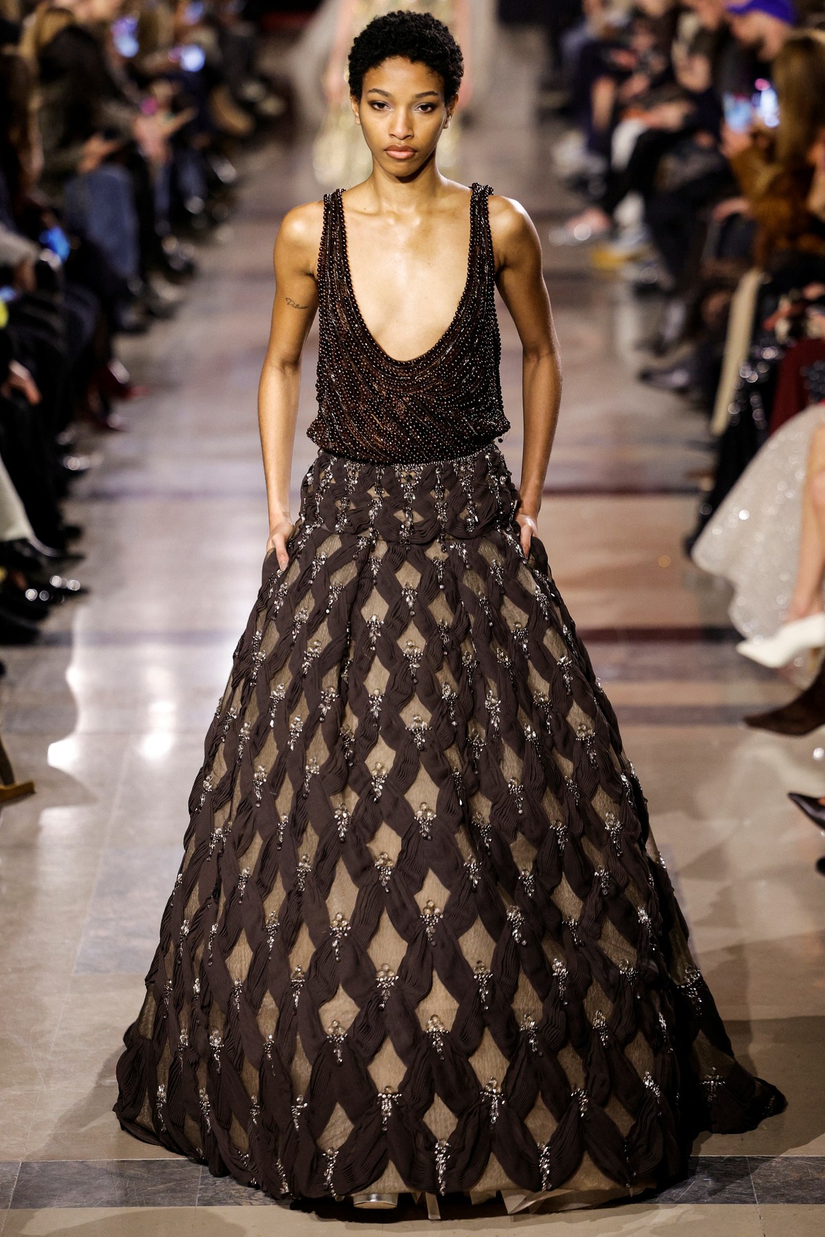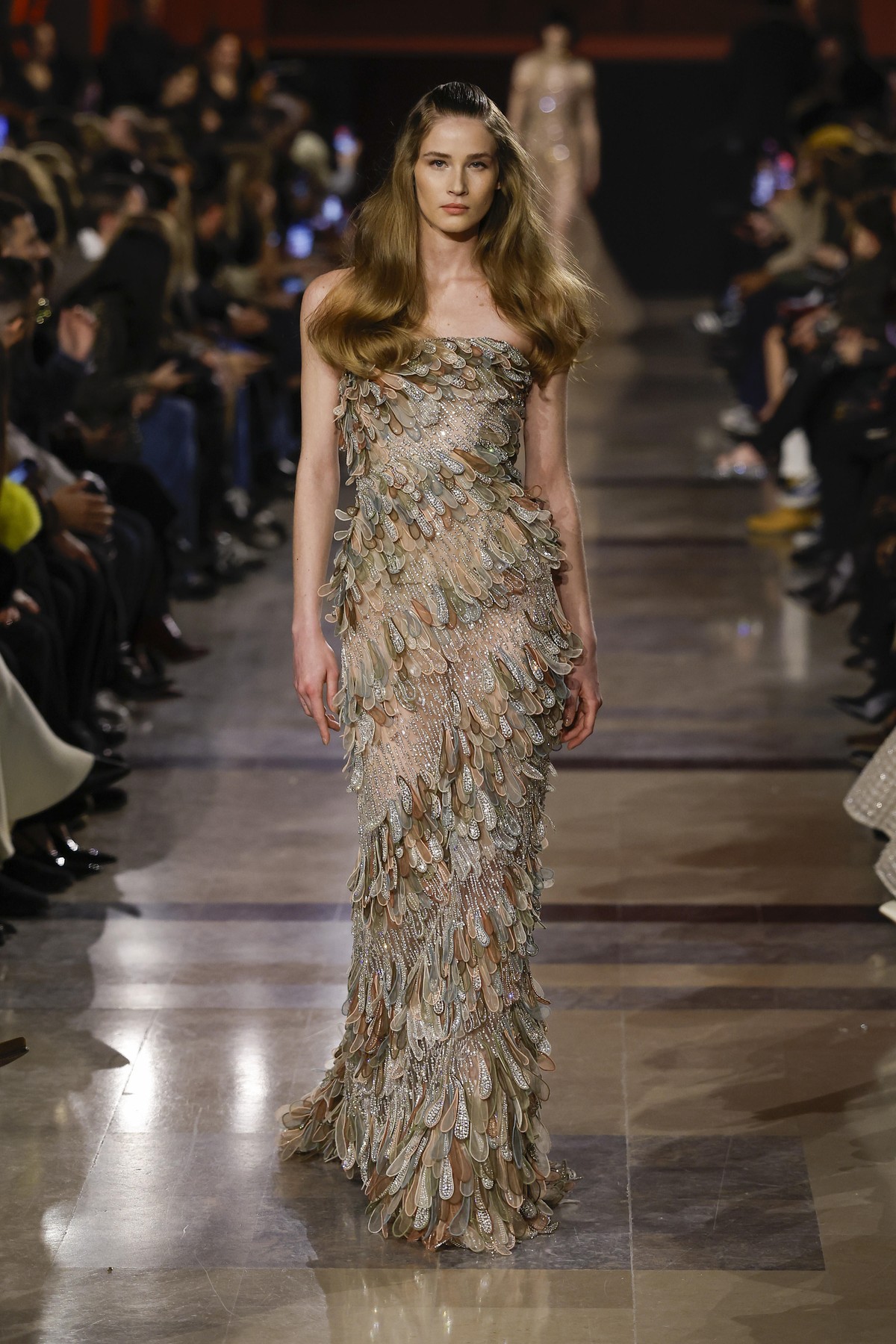 Elie Saab интерпретира носталгията по 70-те години, като поставя акцент върху няколко ключови нови тенденции. Колекцията залага на металически монохроми и се забелязва доминацията на злато, бронз и шоколадови нюанси. Тази бляскава естетика подсказва завръщане към максимализма, но в по-изчистена форма.