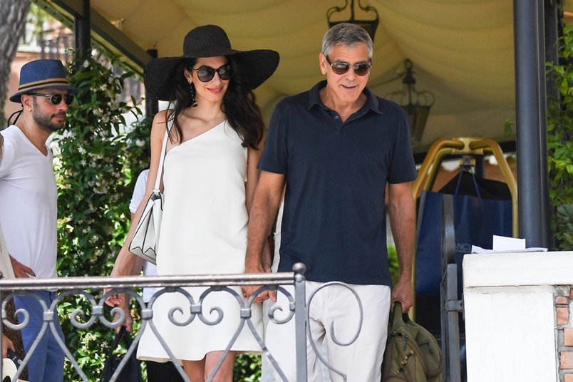 Сега Джордж и Амал почиват във Венеция, където са забелязани вчера следобед. За разходката с яхта по каналите на този красив град, разкошната 41-годишна брюнетка предпочете да облече снежнобяла рокля с едно голо рамо и да сложи черна сламена шапка - елегантна круизна визия в стила на Джаки Кенеди и Грейс Кели, която винаги ще бъде актуална. Амал бе допълнила тоалета си с дълги обеци с кристали, слънчеви очила и снежнобяла чанта.