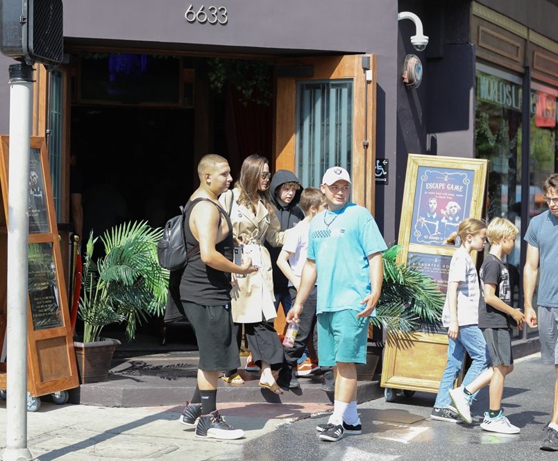 Редки са случаите, когато Анджелина Джоли излиза без децата си. И на разходка в слънчевия Лос Анджелис, както и на среща в бара с дългогодишен приятел, актрисата взема десетгодишните си близнаци - Вивиан и Нокс. Анджелина, която много скоро ще видим на екраните в ролята на Maleficent от филма „Господарка на злото”, изглежда спокойна и щастлива в копринена черна тениска, широки черни ленени панталони и кожени сандали. Когато слънцето се скрива, тя облича любимия си лек тренчкот, с който почти никога не се разделя по улиците на града.