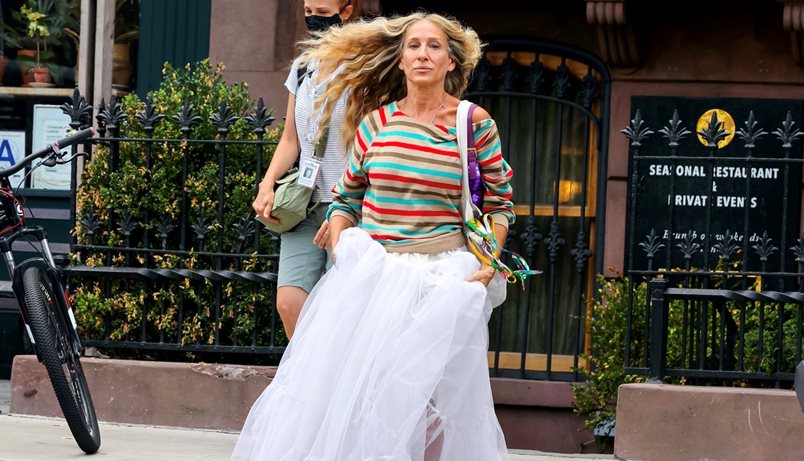 Две десетилетия по-късно SJP съживява носталгичния сет на снимачната площадка на дългочаканото продължение "And Just Like That...”, но в доста по-модерен прочит. Вместо мини версия, костюмните дизайнери на продукцията залагат на актуалната в момента макси дължина, раирана риза и чанта с пайети Fendi. Косата ѝ? Спусната надолу, с обемни къдрици, падащи през раменете.