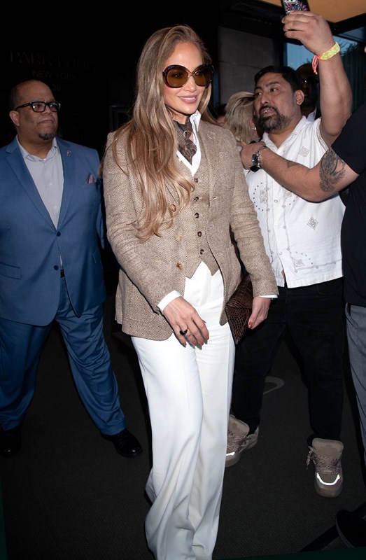 5 октомври. Джей Ло беше забелязана в Ню Йорк, пристигаща за прес конференции, облечена в костюм от Ralph Lauren с кремави панталони, кафяв елек и сако, допълнен от ботуши Alexander McQueen.