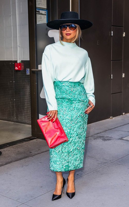 Малко по-късно бе видяна в Midtown, носейки свежа зелена визия от Willy Chavarria, с черни сатенени обувки Rodo и розов клъч.