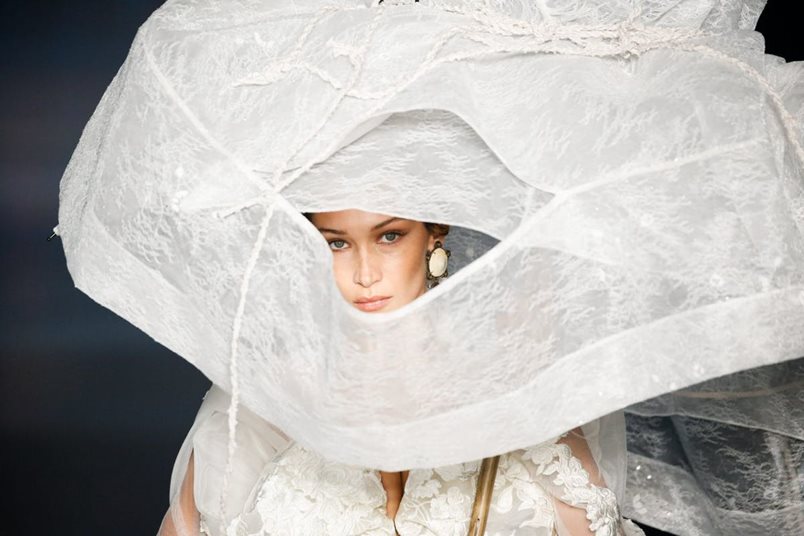 От всички модели, представени на модния подиум, най-много обаче се обсъждаше тоалетът, демонстриран от Бела Хадид. Топ моделът затвори шоуто в сватбена рокля и вместо букет „булката” носеше чадър, наподобяващ огромна деформирана роза.