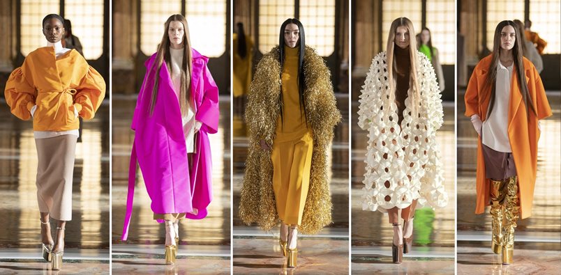 Озаглавена Code Temporal, новата висша модна колекция на Valentino е по-различна от всичко, което сме виждали досега. Вместо богати нюанси, пера и сложни модели, този път луксозният италиански бранд залага на приглушени кремави нюанси, съчетани с неонови, шикозни и същевременно минималистични модели.