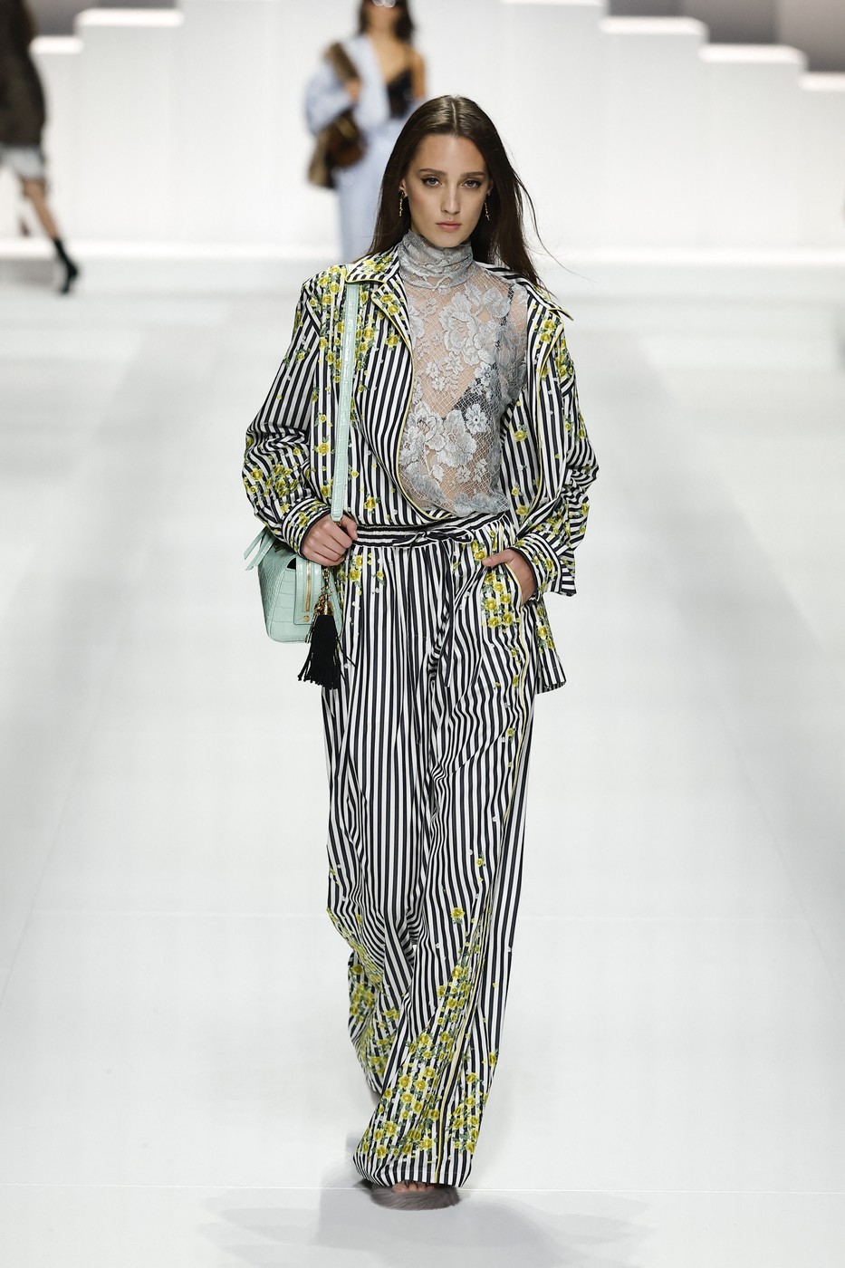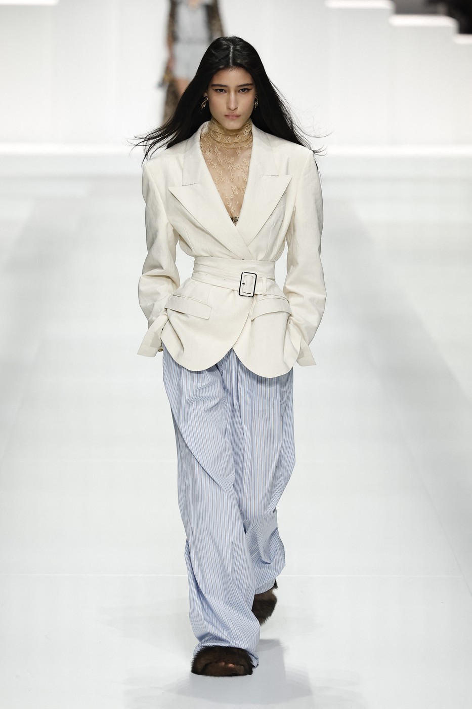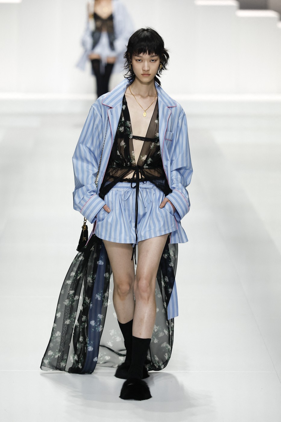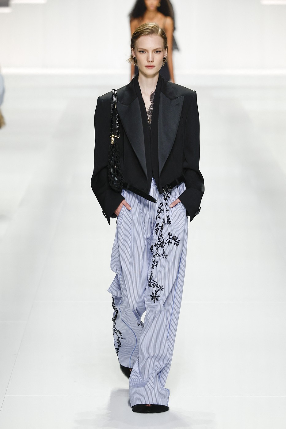 Колекцията предлага дрехи, които изглеждат сякаш току-що извадени от куфар – смачкани, меки, естествени, но съчетани със забележителна елегантност. Свободните силуети, сатенените комплекти, широките ризи и бермудите от фина кожа съжителстват с класически двуредни сака, изразени рамене и вечерни елементи като блясък и бродерии.