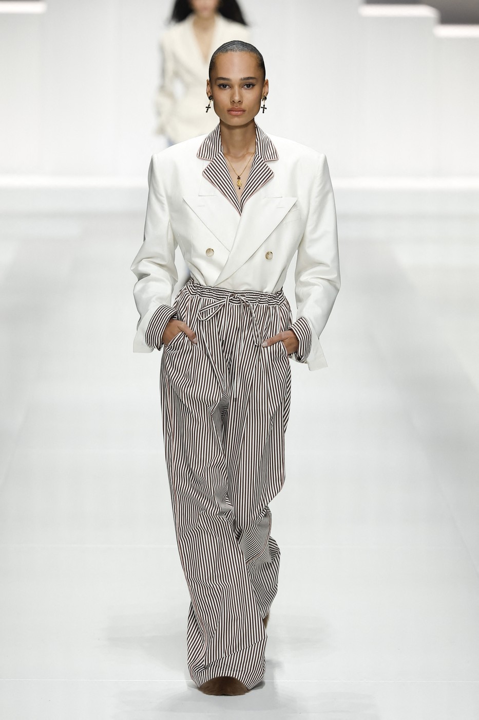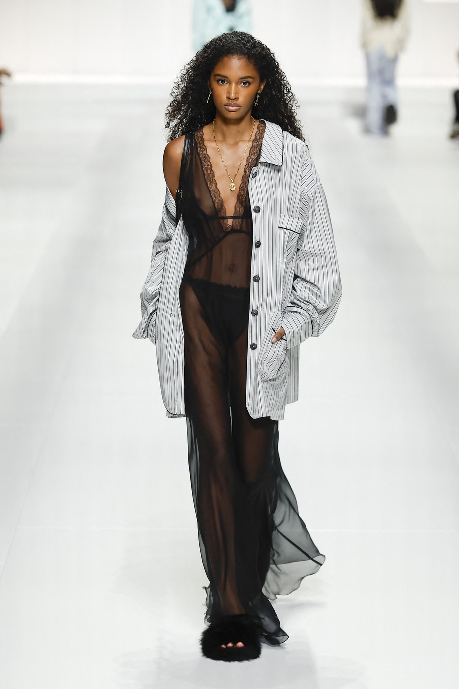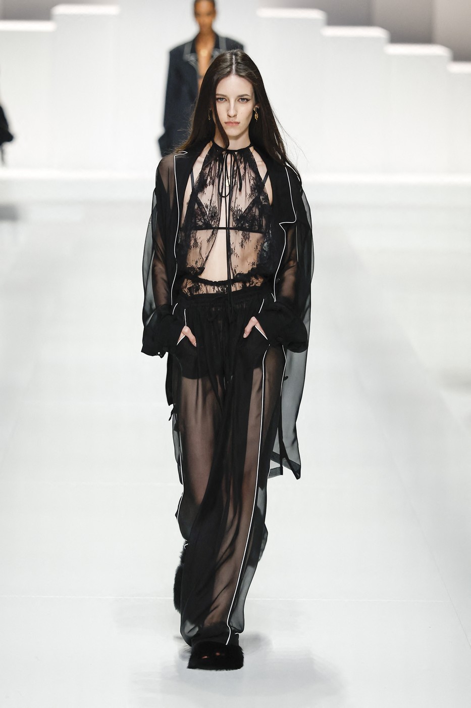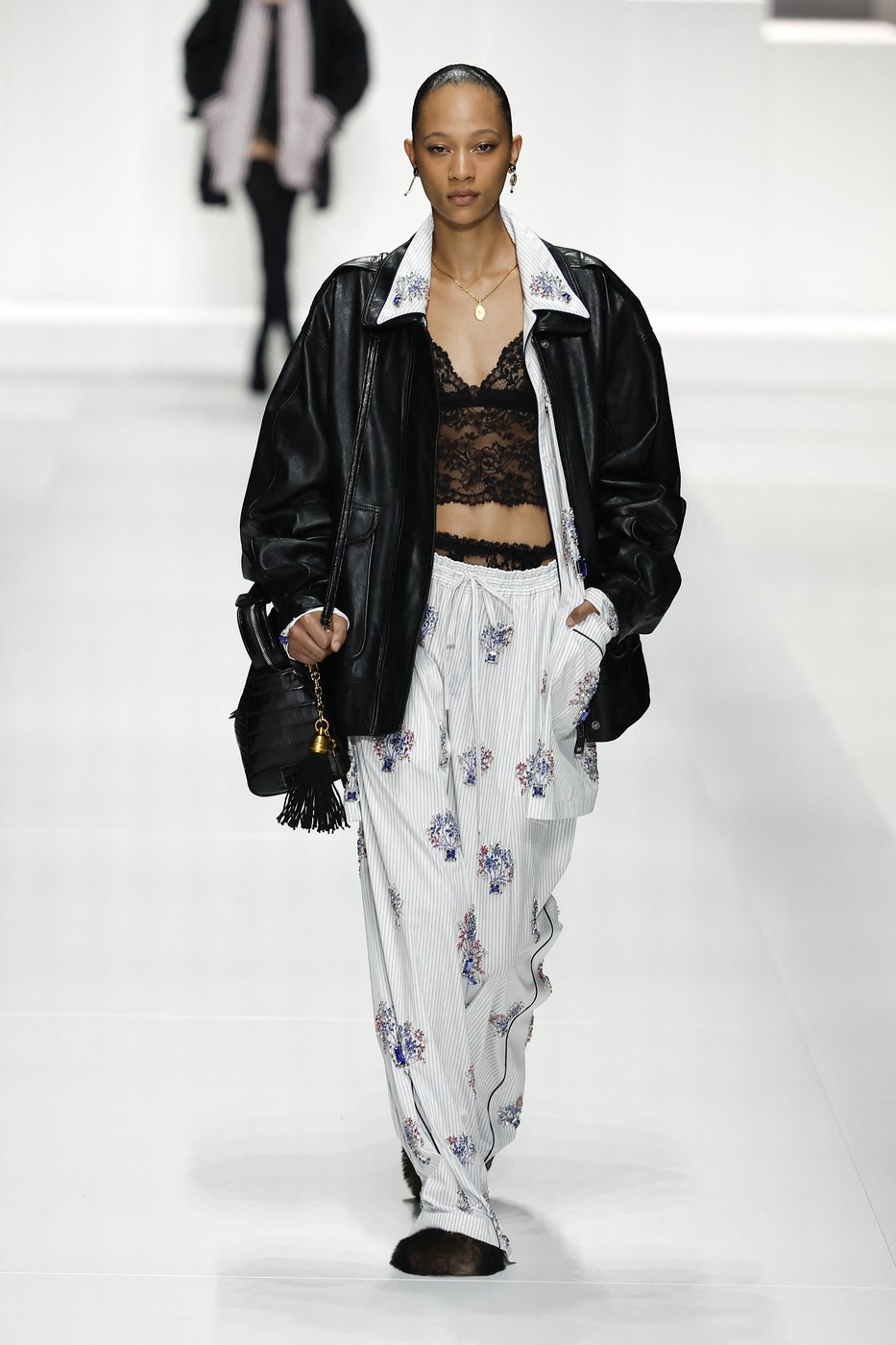 Колекцията предлага дрехи, които изглеждат сякаш току-що извадени от куфар – смачкани, меки, естествени, но съчетани със забележителна елегантност. Свободните силуети, сатенените комплекти, широките ризи и бермудите от фина кожа съжителстват с класически двуредни сака, изразени рамене и вечерни елементи като блясък и бродерии.
