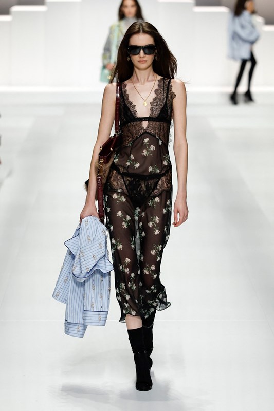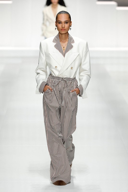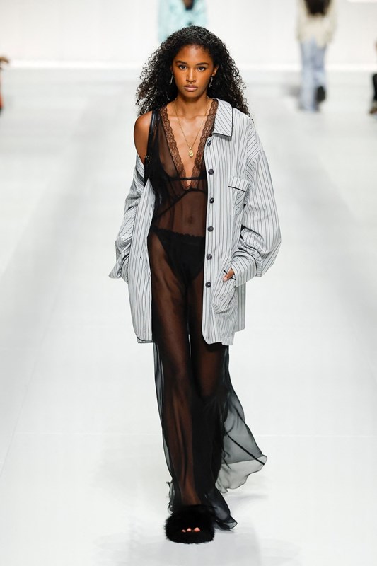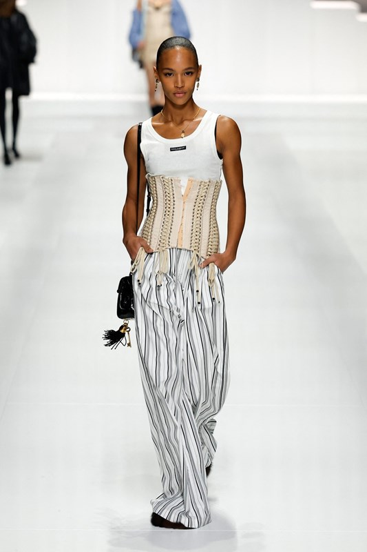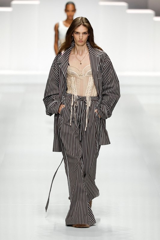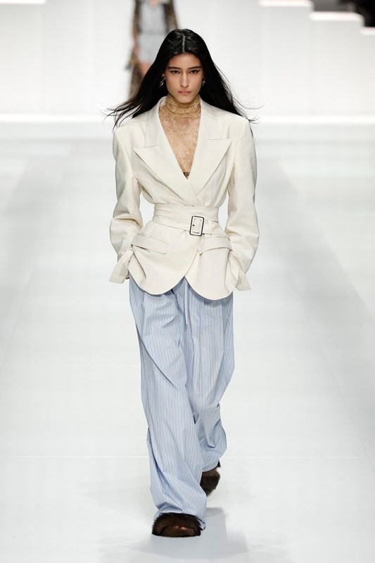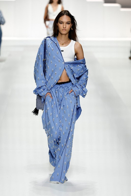 Колекцията предлага дрехи, които изглеждат сякаш току-що извадени от куфар – смачкани, меки, естествени, но съчетани със забележителна елегантност. Свободните силуети, сатенените комплекти, широките ризи и бермудите от фина кожа съжителстват с класически двуредни сака, изразени рамене и вечерни елементи като блясък и бродерии.